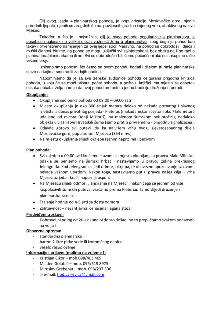 Cilj ovog, sada 4.planinarskog pohoda, je popularizacija Moslavačke gore, njenih prirodnih ljepota, njenih smaragdnih šuma, povijesnih gradina i njenog vrha, atraktivnog naziva Mjesec.