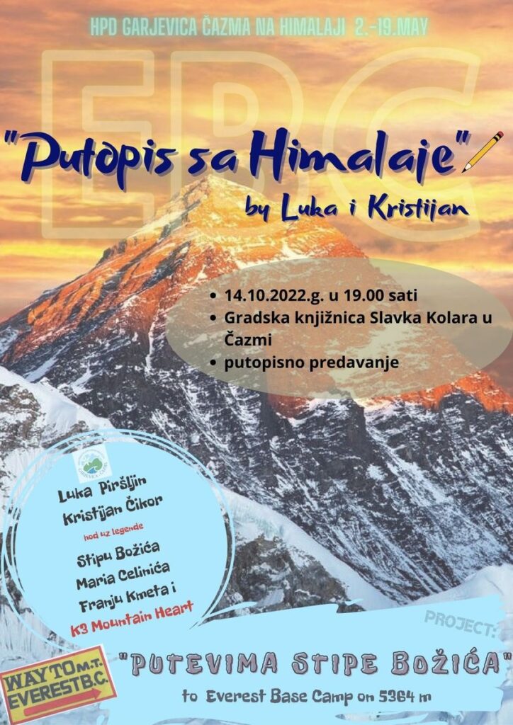 Prvo će na inicijativu Gradske knjižnice Slavko Kolar Čazma, biti (već je!) održano predavanje Luke Piršljina i Kristijana Čikora, pod naslovom “Putopis sa Himalaje”, a gdje će imenovani svojim sugrađanima i prijateljima ispričati priču o svom boravku na najvećem planinskom masivu na svijetu – Himalaji. Svoje emocije koje su tamo proživjeli, pokušati će po prvi puta prenijeti i podijeliti sa svim zainteresiranim ljudima.