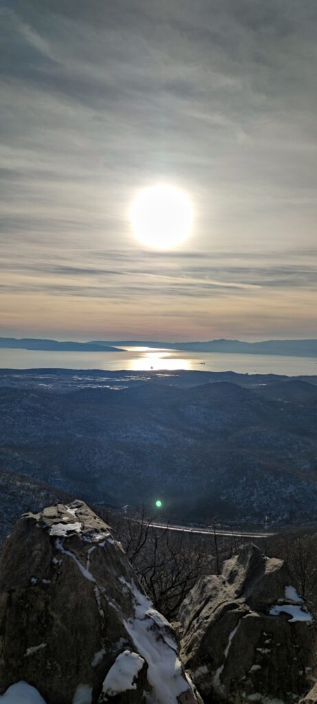 Kako je spust do Platka bio relativno brz, a vrijeme predivno, iskorišteno je to na najbolji mogući način. Stjenoviti vrh Kamenjak koji je jedan od najljepših vidikovaca na cijeli Kvarnerski zaljev bio je šlag na ovu slatku, zimsku tortu. Zalazak Sunca iznad Kvarnera bio je spektakularan.